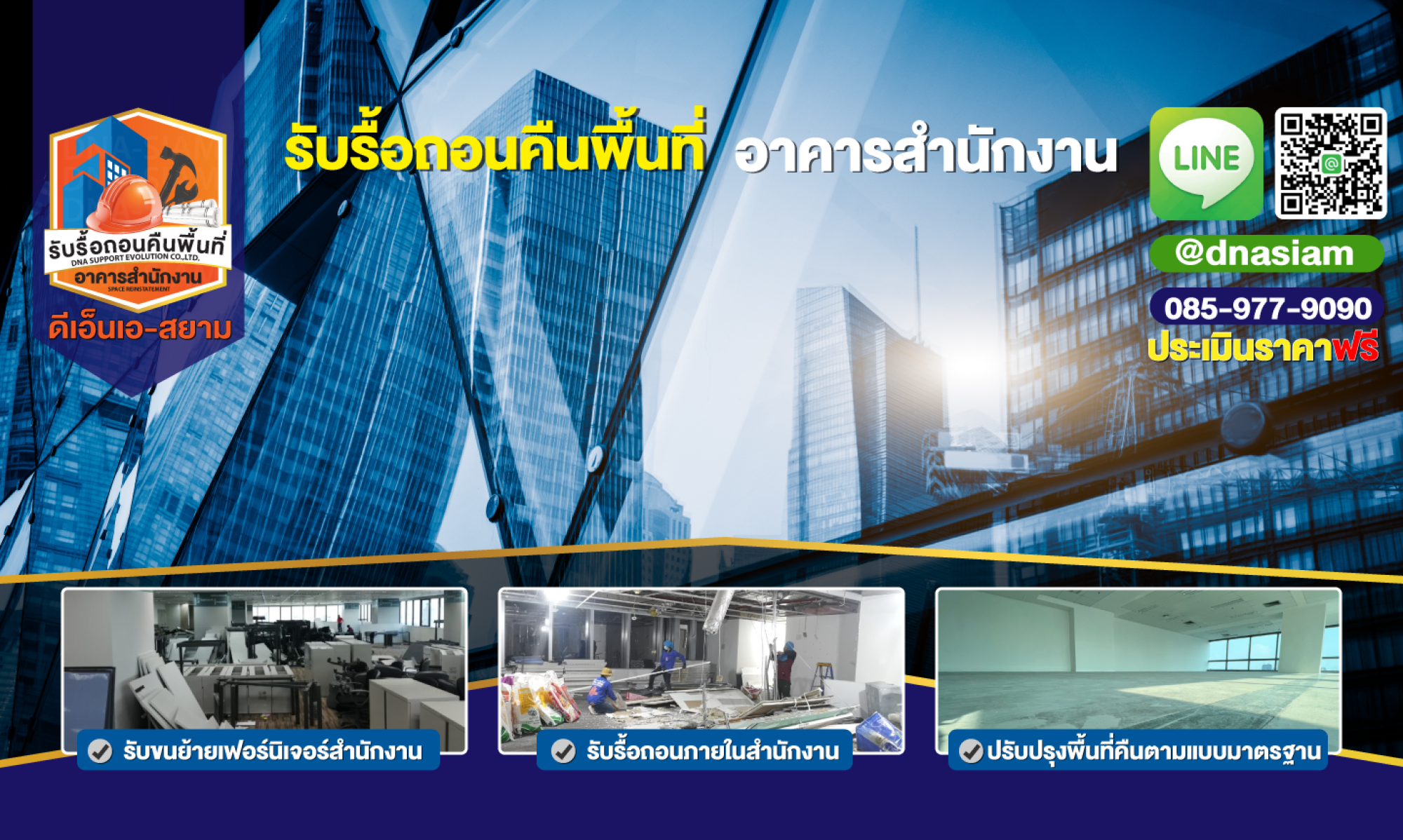หากต้องการบริการรื้อถอนและคืนพื้นที่สำนักงานที่ได้มาตรฐาน ปลอดภัย และตรงเวลา ติดต่อ บริษัท ดีเอ็นเอ โทร 085-977-9090 ทีมงานของเราพร้อมให้บริการคุณ!