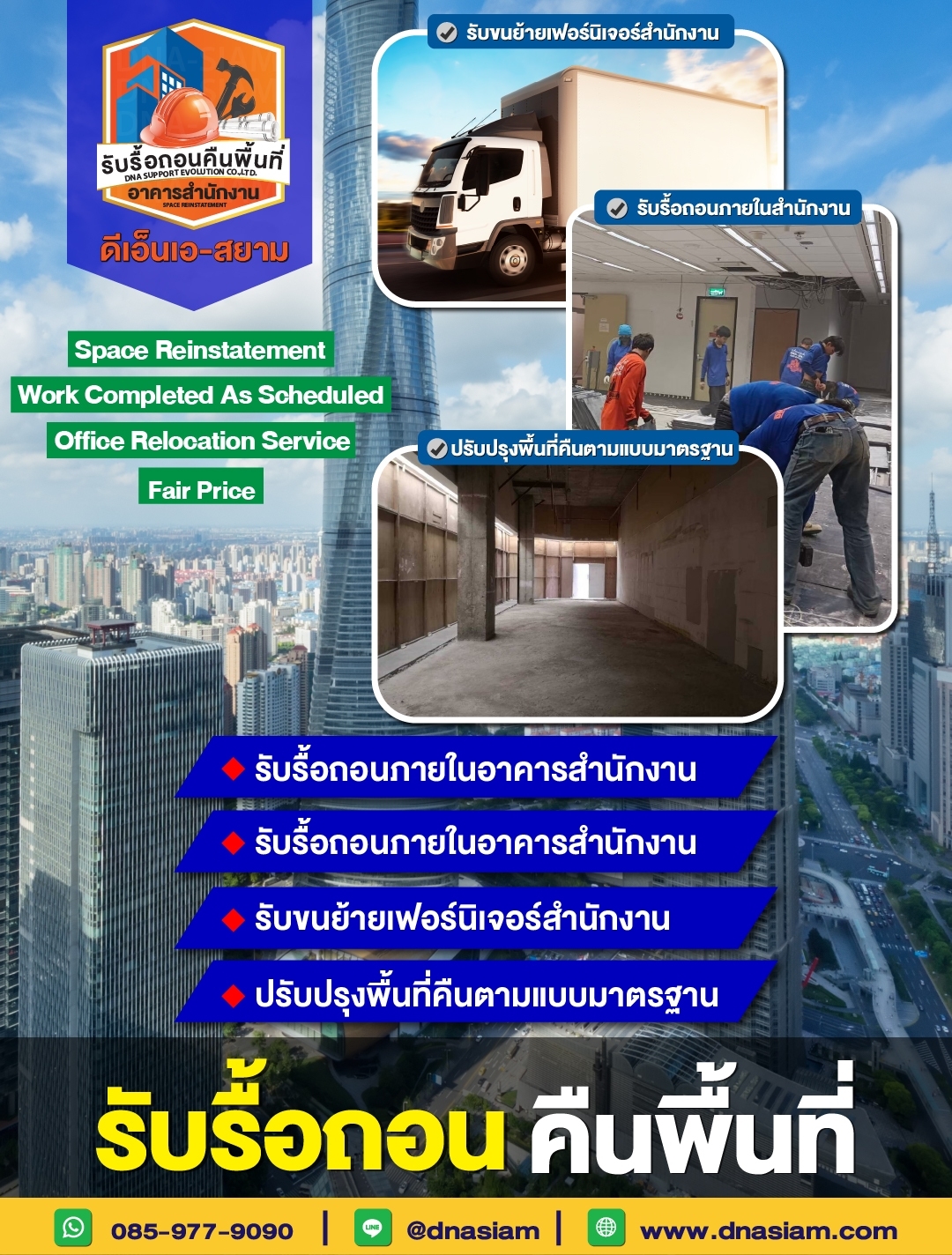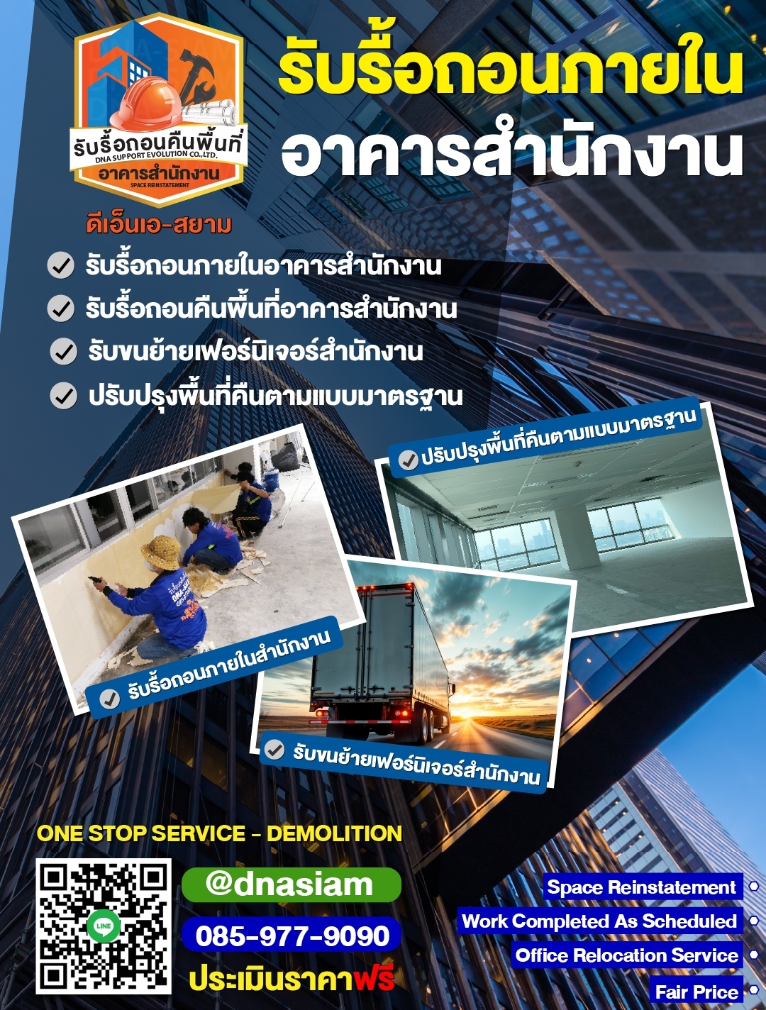 หากต้องการบริการรื้อถอนและคืนพื้นที่สำนักงานที่ได้มาตรฐาน ปลอดภัย และตรงเวลา ติดต่อ บริษัท ดีเอ็นเอ โทร 085-977-9090 ทีมงานของเราพร้อมให้บริการคุณ!